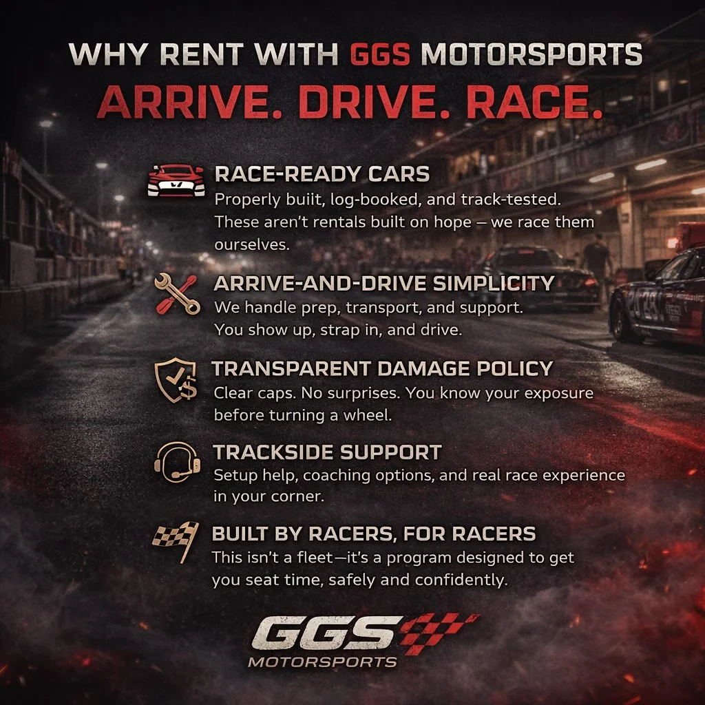 Complete arrive-and-drive race weekend experience, handling everything from car transport, prep, trackside support, maintenance and hospitality—so you can focus entirely on driving.